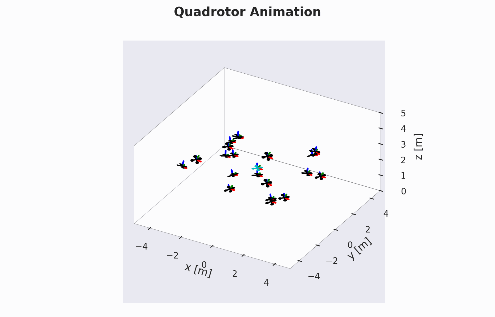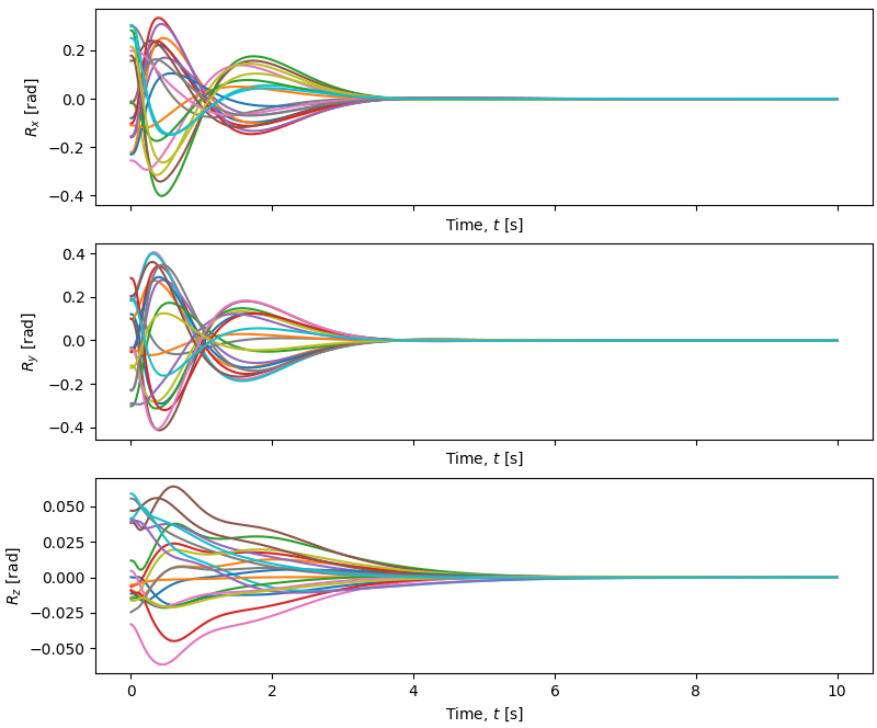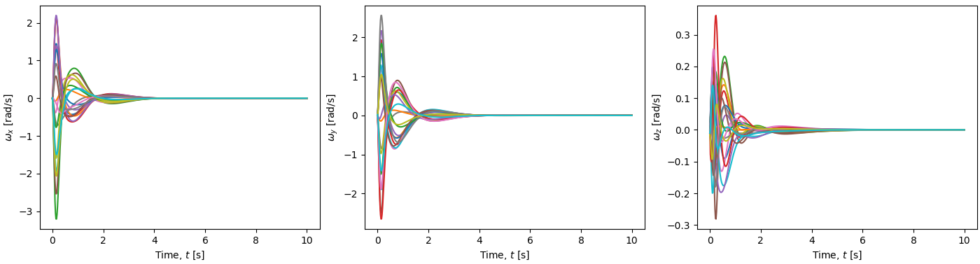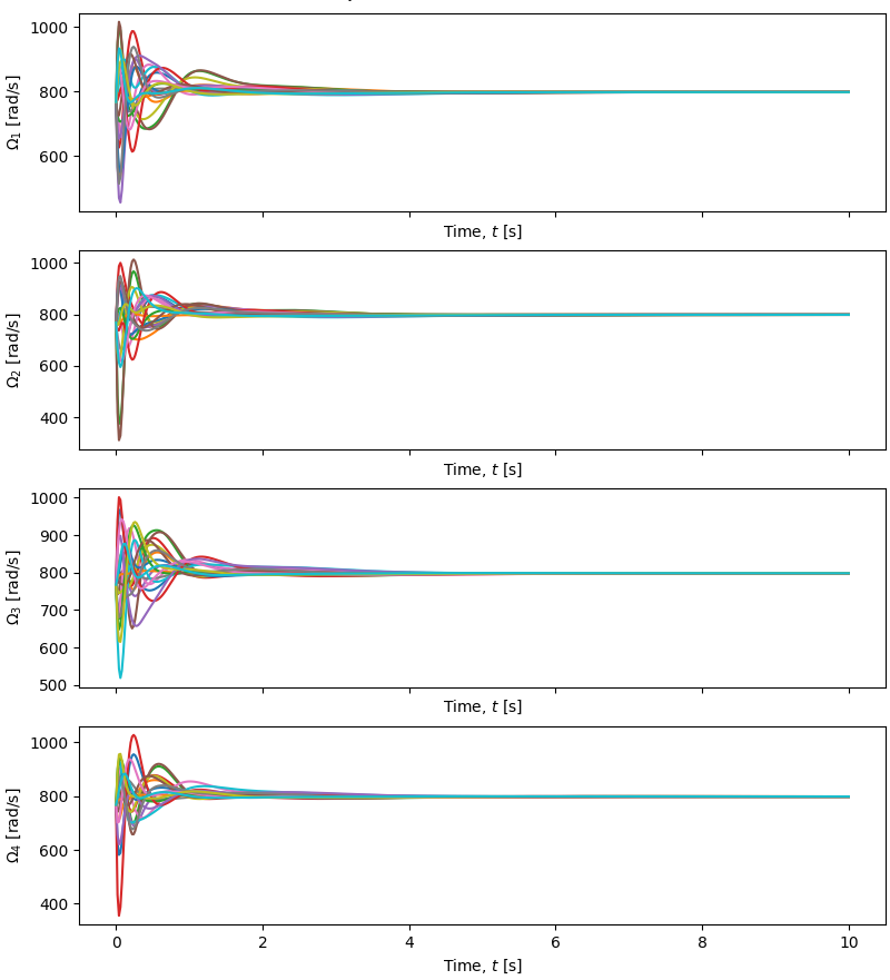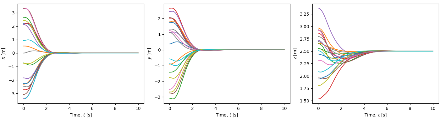 We can test the performance of the controller on various quadrotors initialized at states within a reasonable range for the small-angle approximation to hold. Such tests produce the following results in a lightweight simulator.
